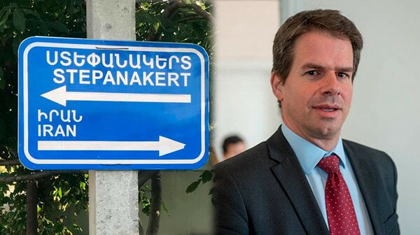 French Ambassador to Armenia Jonathan Lacôte on Tuesday posted a photo on social media showing him standing next to a street signboard to Stepanakert and to Iran.