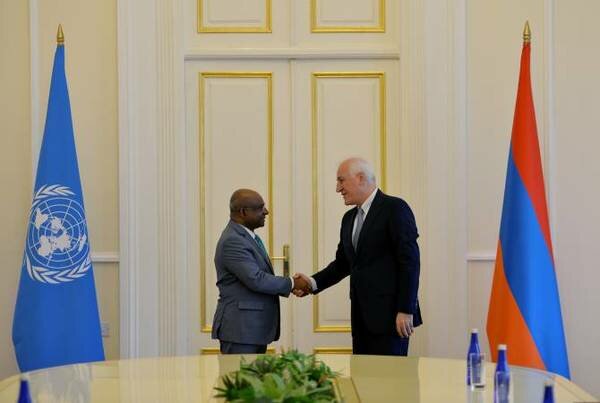 «Рад приветствовать Вас в Республике Армения. Ваш визит совпал с 30-летием членства Республики Армения в Организации Объединенных Наций. Это был март 1992 года. Однако в декабре у нас есть еще одно знаменательное событие, ведь в декабре 1992 года состоялось открытие Офиса ООН», - сказал президент Хачатурян. «После приобретения независимости, одним из наших желаний было желание стать членом ООН, потому что мы понимали, что дальнейшее развитие нашего государства невозможно без сотрудничества с ООН. Наша история за эти 30 лет показала, что мы действительно добились успехов при содействии Организации Объединенных Наций, имевшего большое значение для становления нашего государства. Особо хочу отметить создание демократических институтов, в которых роль ООН была очень велика. В течение этих 30 лет наше государство активно сотрудничало со всеми структурами ООН, реализовывало различные программы, которые в основном были направлены на ликвидацию нищеты и неравенства, а также создание юридически стабильного государства.